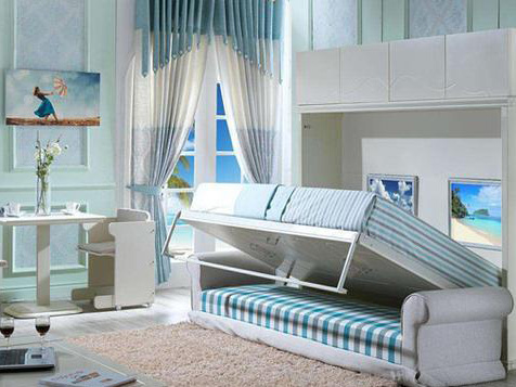 這種“隱形床”其實就是(shì)一個活動的、可收放的壁掛式(shì)床,通常我們把它跟牆壁上的櫥櫃、書櫃融為一體。白天的時候把床收起來,這個房間就是一個書房、工作室或者是兒童的遊樂場(chǎng),使得空間的利用率大大(dà)提(tí)升(shēng)了。要是在臥室放大床(chuáng)的話,這個房間隻能作為睡覺(jiào)的地方使用。花那麽多的錢買的房子,不讓它為我(wǒ)們多效勞,那豈不是太對不(bú)起我們花的錢了。